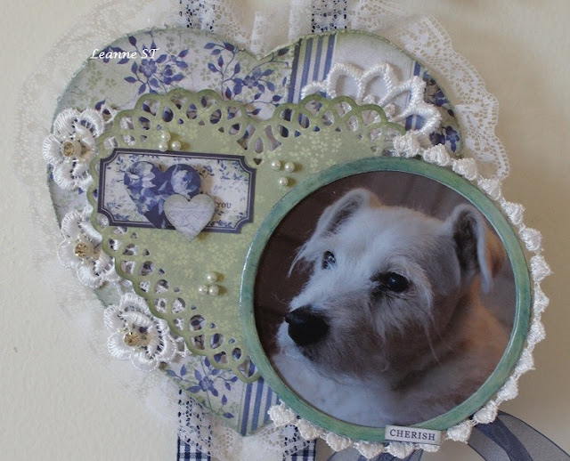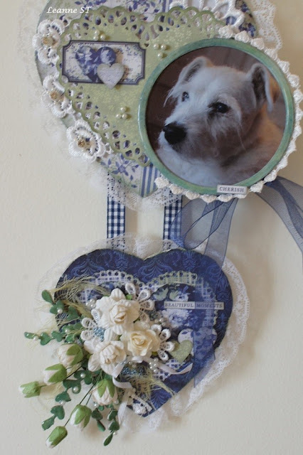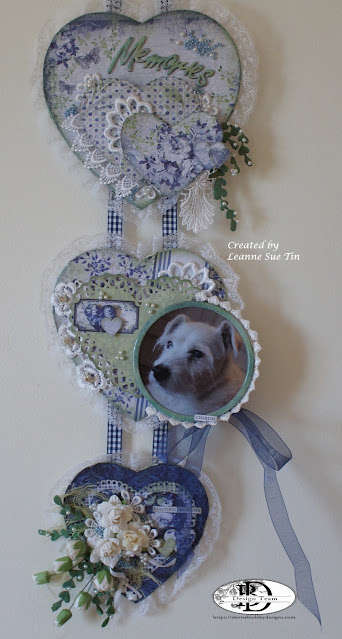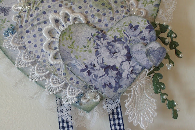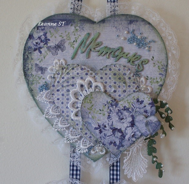 I have added lots of different pretty lace trims. I then arranged some ribbon between each heart & some to hang my wall hanging.