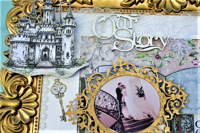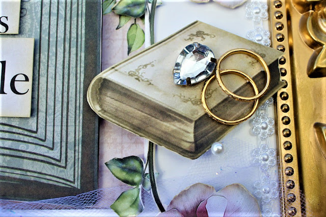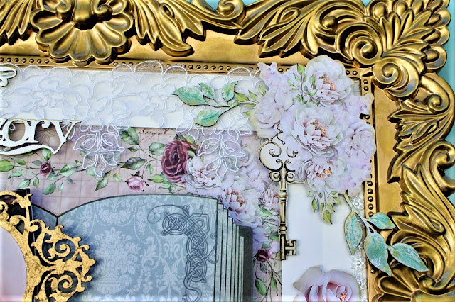 I started with nature's romance paper from the le Jardine Romantique collection. I added some gold leaves by using a stencil.