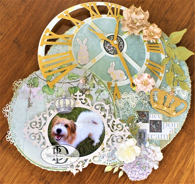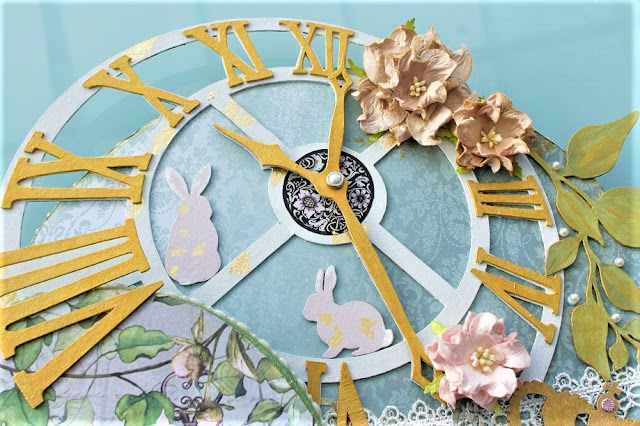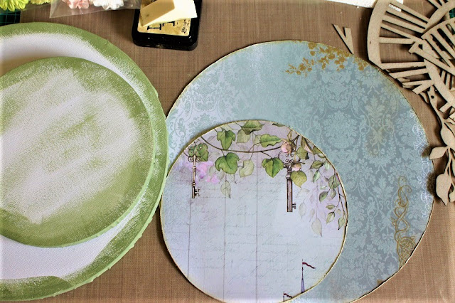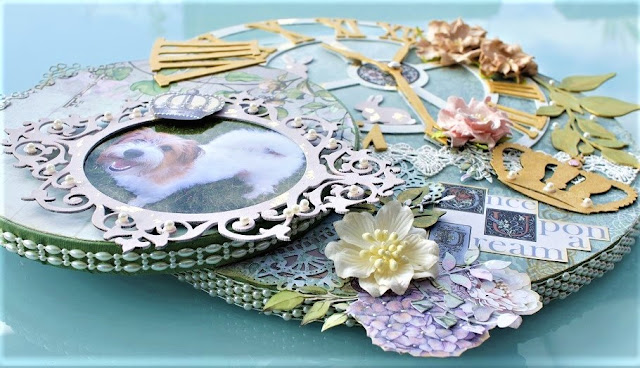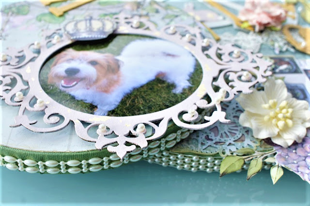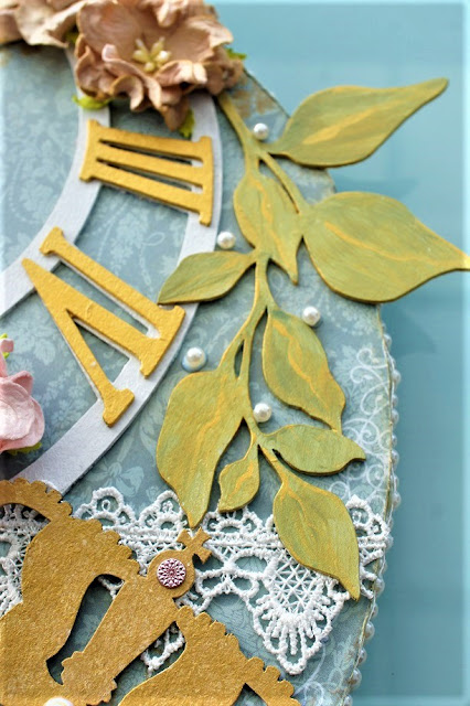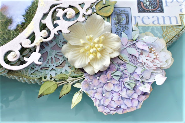 Attached some pretty lace under the chipboard then added a nice post of flowers at the bottom